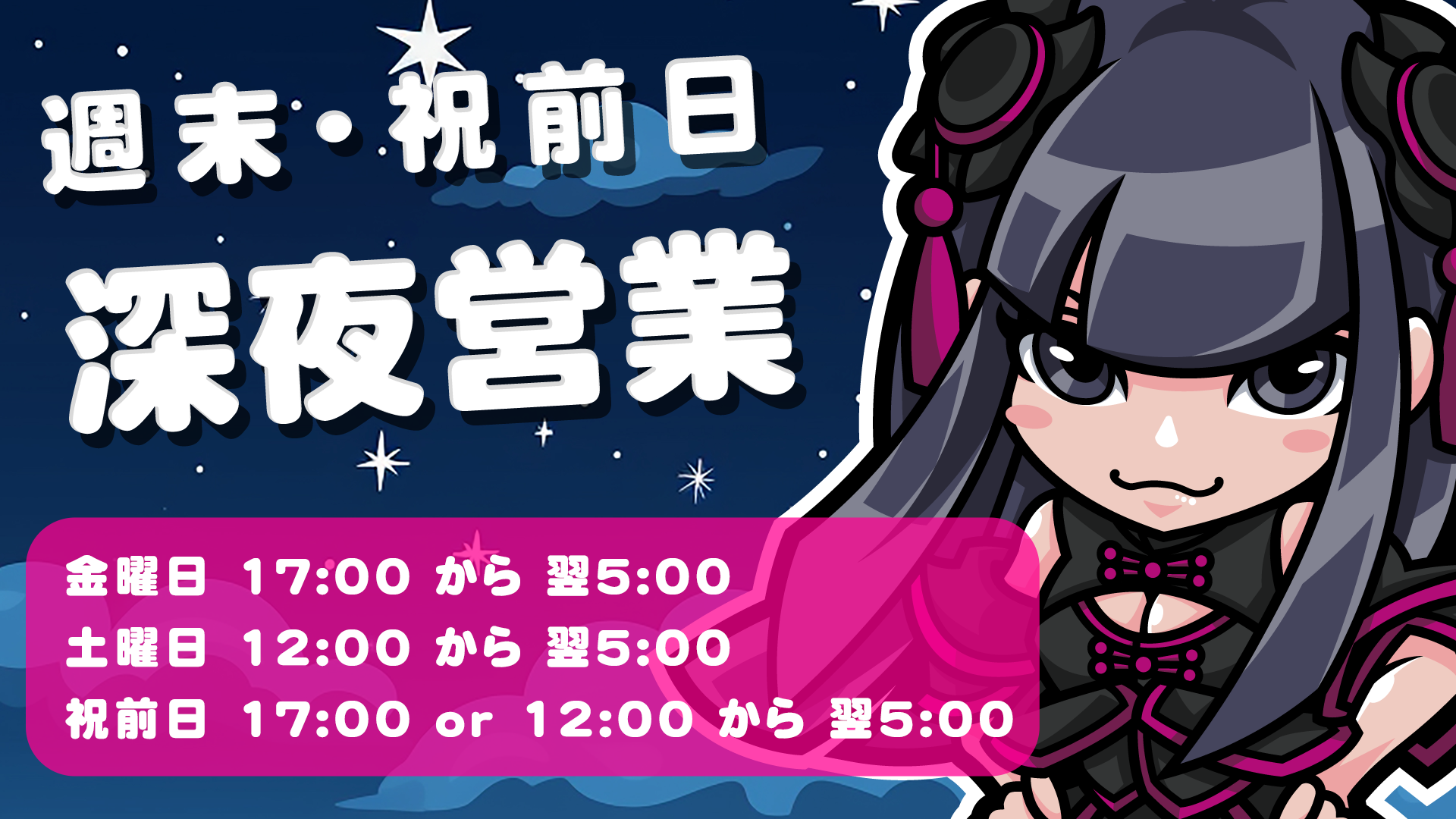 金曜日 open 17:00 〜 close 翌5:00 土曜日 open 12:00 〜 close 翌5:00 祝前日 open 17:00 or open 12:00 〜 close 翌5:00 深夜パックなどもありとってもお得‼️